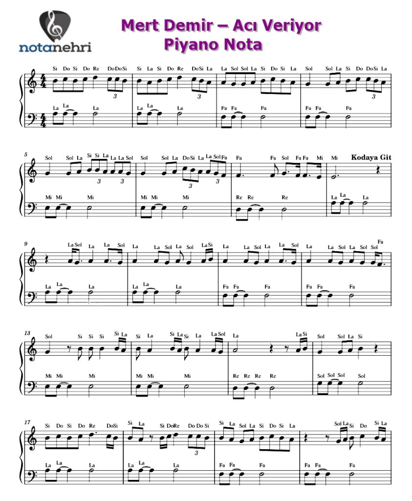 Bu yazımızda Mert Demir‘in seslendirdiği Acı Veriyor şarkısının kolay nota ve piyano notalarını paylaştık. Şarkının söz ve müziği Rıza Sarıtaş‘a aittir. Notasyonu si bemol karar yorumlanmış olan bu şarkının notasını la karar tonda paylaştık. Resim dosyalarının altında PDF dosyasını da ekledik. Bilgisayarına indirip kaydedebilirsiniz. Keman, flüt, org, melodika notalarını basit şekilde çalabilmeniz için ekledik. Bütün enstrümanlar için ortak notadır. Piyano düzenlemesini kolay piyano şeklinde hazırladık. Sol elde tek sesli eşlik bulunmaktadır.
