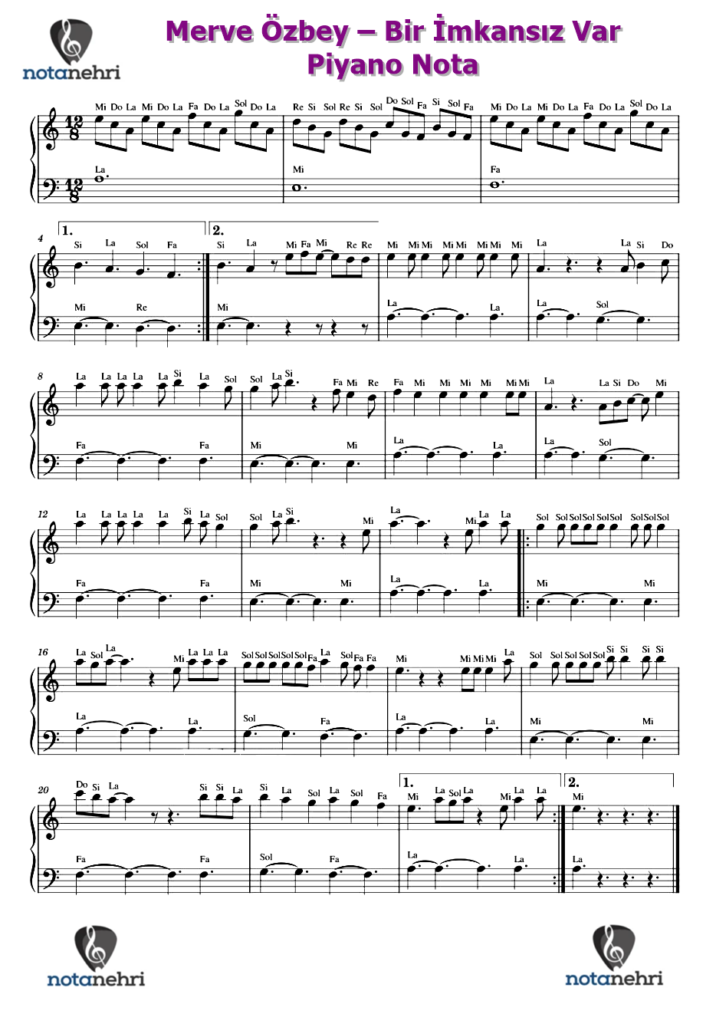 Bu yazımızda Merve Özbey‘in seslendirdiği Bir İmkansız Var şarkısının kolay nota ve piyano notalarını paylaştık. Şarkının söz ve müziği Emrah Karaduman‘a aittir. Notasyonu la minör yorumlanmış olan bu şarkının notasını aynı tonda paylaştık. Resim dosyalarının altında PDF dosyasını da ekledik. Bilgisayarına indirip kaydedebilirsiniz. Keman, flüt, org, melodika notalarını basit şekilde çalabilmeniz için ekledik. Bütün enstrümanlar için ortak notadır. Piyano düzenlemesini kolay piyano şeklinde hazırladık. Sol elde tek sesli eşlik bulunmaktadır.